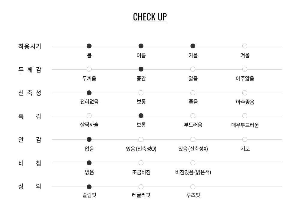 상체의 라인을 과하지 않게 따라가도록 설계된 슬림핏으로 제작하여 어깨 라인은 자연스럽게 맞춰주고, 가슴과 허리 부분을 점진적으로 정리해 불필요한 여유를 줄임으로써 깔끔하고 날렵한 실루엣을 완성합니다.